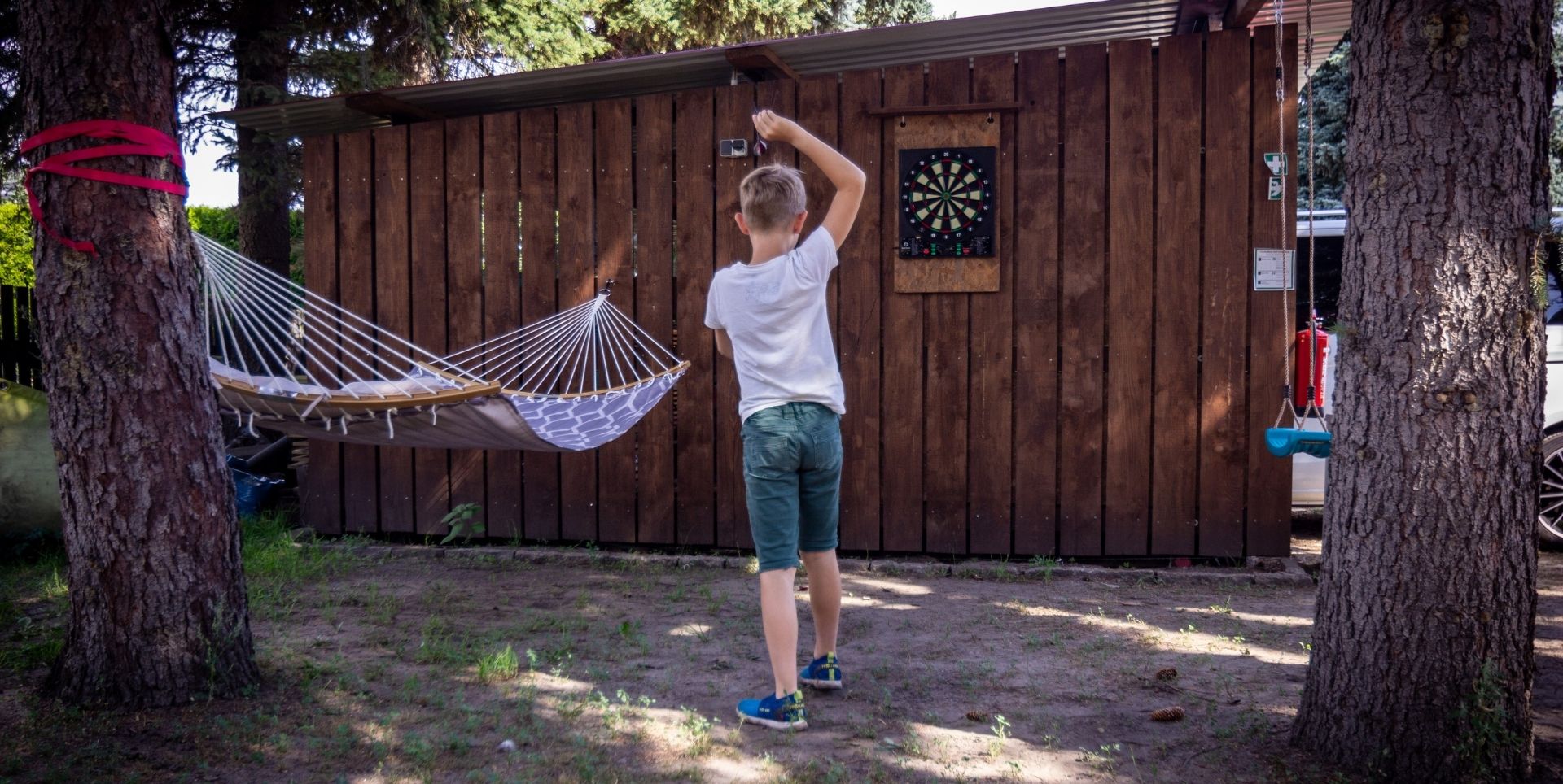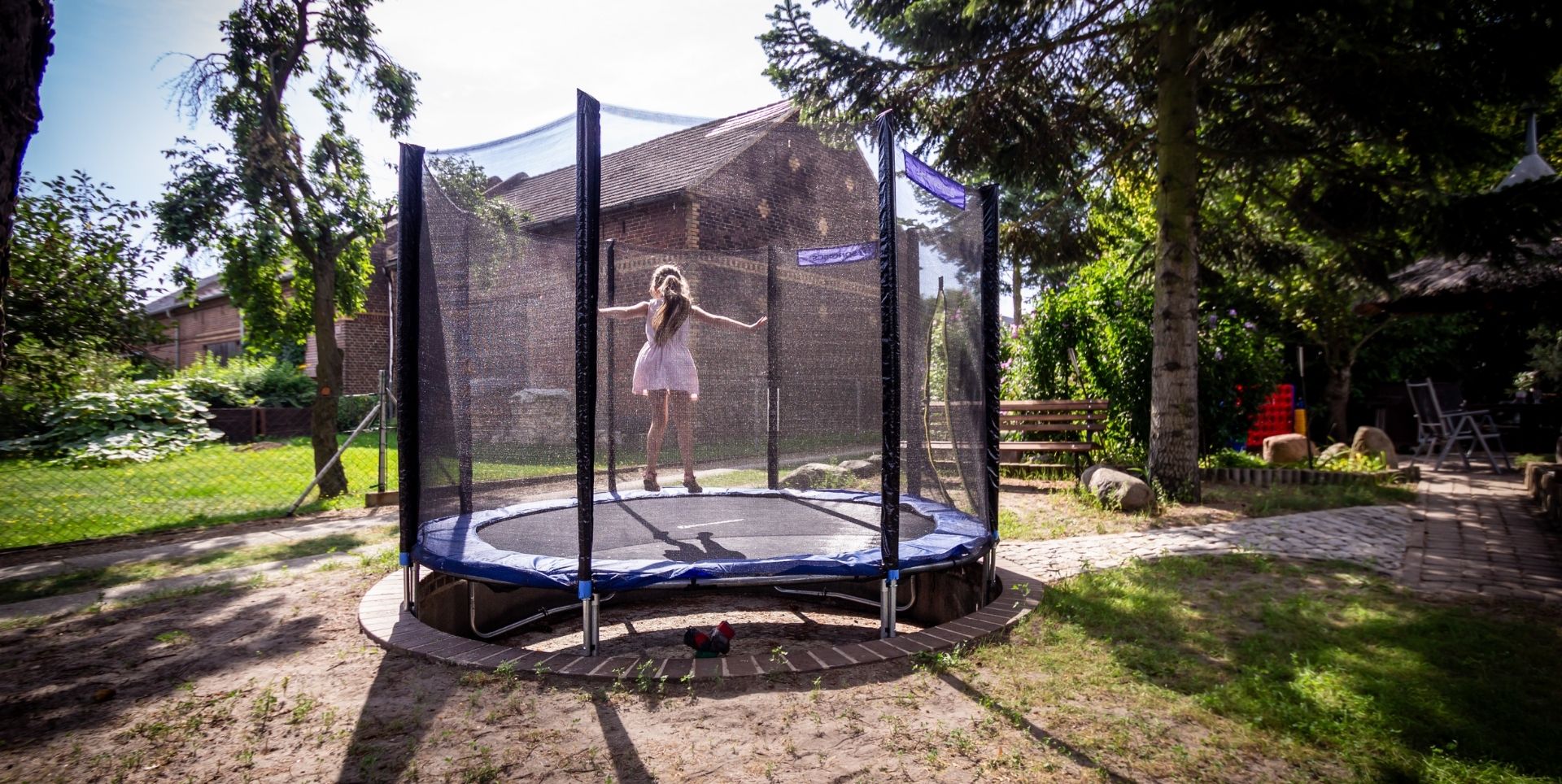 Für Groß und Klein: Trampolin, Schaukel, Hängematte, Tischtennis, Darts und eine Spielwiese für Federball oder Volleyball.